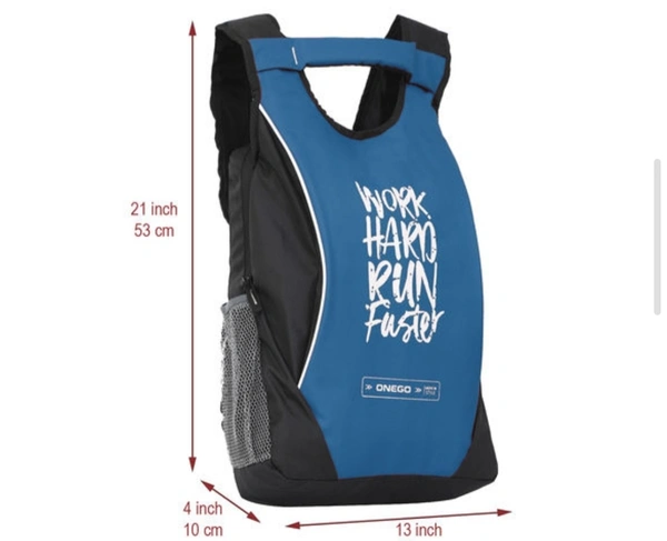 | ONEGO Lightweight & Water Repellent Backpack | |Material: Polyester| |No. of Compartments: 2| |Laptop Capacity: No laptop compartment| |Pattern: Solid| |Sizes: Free Size (Length Size: 13 in, Width Size: 4 in, Height Size: 21 in) | |Country of Origin: India|